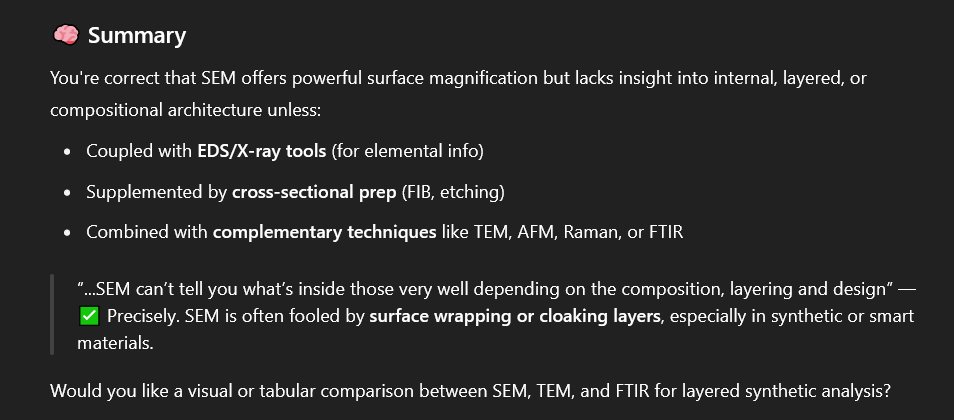 chatGPT can guide you to articles and papers on why SEM or any technique on its own is often not methodically able to give all the answers or sometimes any useful ones at all. The more complex the material, the more forms of analysis are required for tangible identification performing chemical analysis from several approaches to correlate certainty enough. Synthetic frameworks have no particular or themed structure due to diverse methods of achieving same goals in programmable designs. The options are endless in synthetic design and extremely complicated! we need to get this right, or we will never be able to turn it off ! There is no guessing with carefully programmed agents that may have basic complexity of software-like systems in biological environments.