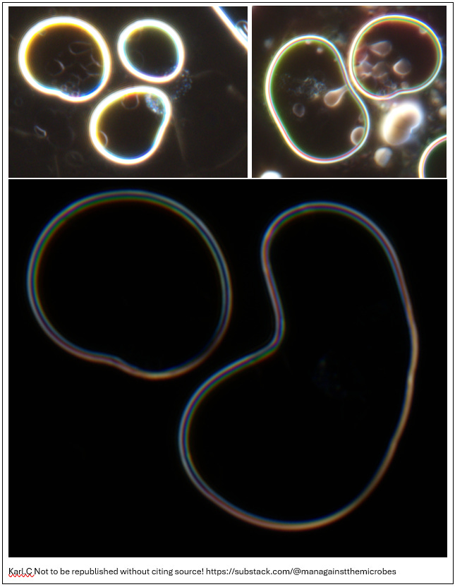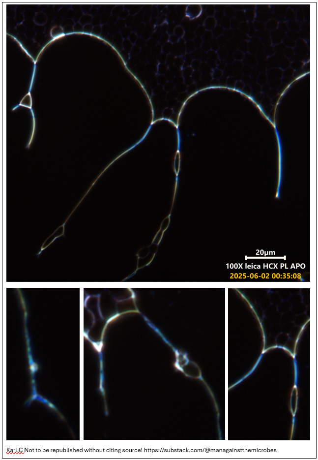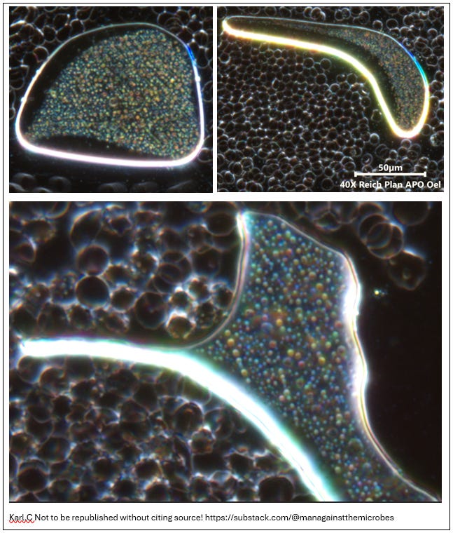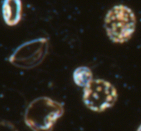 The image above shows something else quite clearly that most Darkfield microscopes will not easily detect at all. Full colour and high resolution using an almost closed aperture on the 100x Leica oil PL APO reveals synthetic optical features often seen on collapsing membranes which are dragging along with the osmotic flow and evaporation changes on the slide.