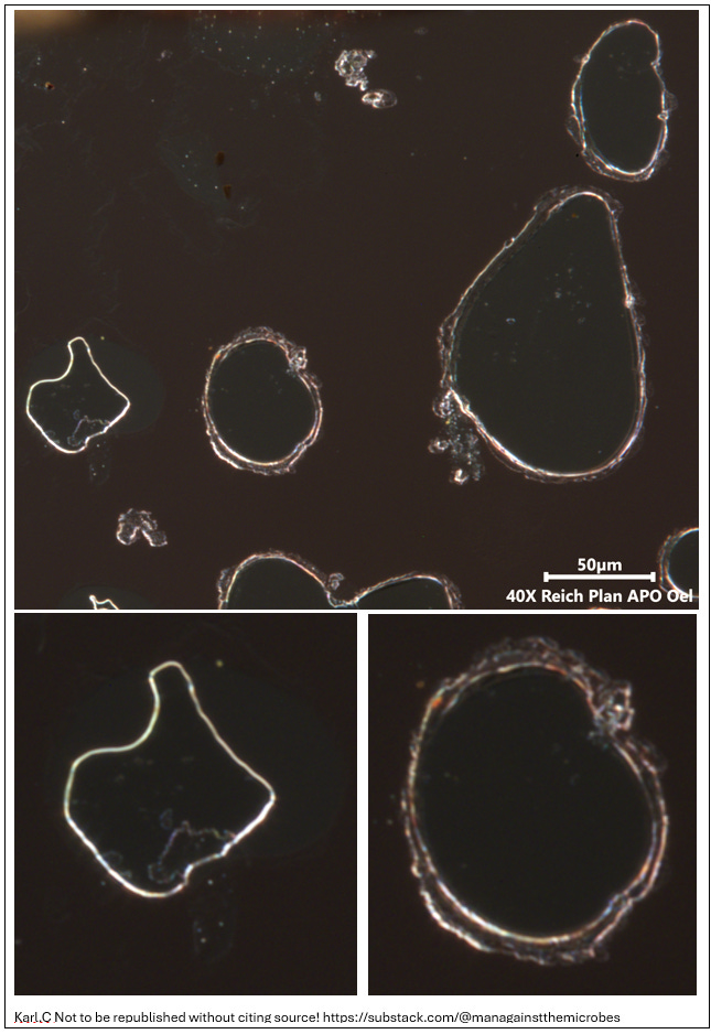 had noticed more than 2 years ago. Vesicles are often seen near solid-phase-hybrid-polymer materials. Fibers, unshapely forms, and sheets that show hybrid-like optical characterization are apparent, as many can attest to having seen in the last 5 years. This is because there is most likely a hydrogel material concentrated within the vesicle itself. It doesn’t mean that these solid structures should form this way, but it shows that the vesicle has the ability to form complexly ordered materials with non random internal structuring. The two options are what is seen in this form and what this material could do as a tissue scaffolding system. When you hone in on all the structural features, selectively aligned particles, different forms of assembly across different sample types, and across various environment variables, it is clear that these are as complex as you would expect the behavior to be if a tissue engineering framework was also included in the package. I shall explain in more detail, in………you guessed it……. a paper. I also would like to reserve the consideration that PEG is still not a lone suspect where hydrogel is concerned. I still believe there are signs of multiple hydrogel types according to dye experiments and that makes sense. It would not be unlikely that maybe in the blood plasma there is a different hydrogel product or a variety of what is in the vesicles. Penetrating the membranes of these vesicles with dye has been challenging, and that also isn’t a good sign in terms of implication for membrane selectivity and complexity of function.See what I meant by hybrid lipid vesicles. This is just one marker of many experiments which show distinct identification points. The more coherently formed vesicle on the left shows healthy and in tact vesicle membrane. The other vesicles destabilized first and they have undergone phase separation between all of the programmable materials in the membrane. You can even see hints of modularly placed colour embedded in the top curve of the bottom right blown up image.