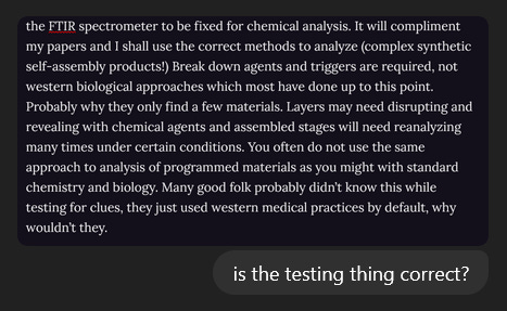 Thank you for reading, and even more thanks for helping to fund the parts for the FTIR spectrometer to be fixed for chemical analysis if you have done so already, and if you decide to do so. It will compliment my papers and I shall use the correct methods to analyze (complex synthetic self-assembly products!), Break down agents and triggers are required, not western biological approaches which most have done up to this point. Probably why they only find a few material leads with no real joy, this is to be expected.