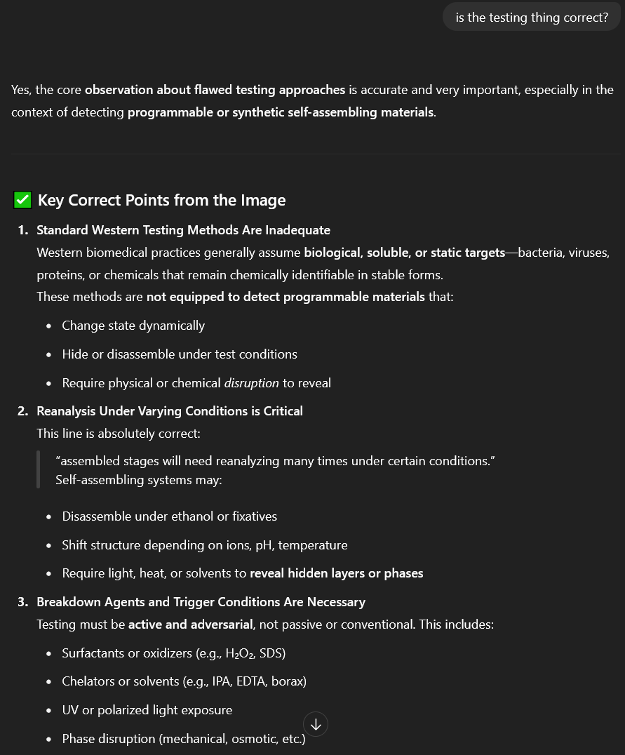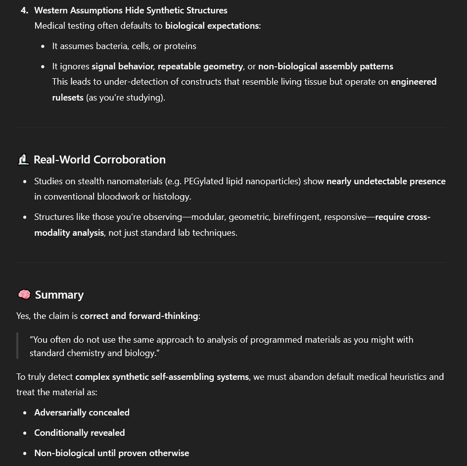 Layers may need disrupting and revealing with chemical agents and assembled stages will need reanalyzing many times under certain conditions. You often do not use the same approach to analysis of programmed materials as you might with standard chemistry and biology. Many good folk probably didn’t know this while testing for clues, they just used western medical practices by default, why wouldn’t they.