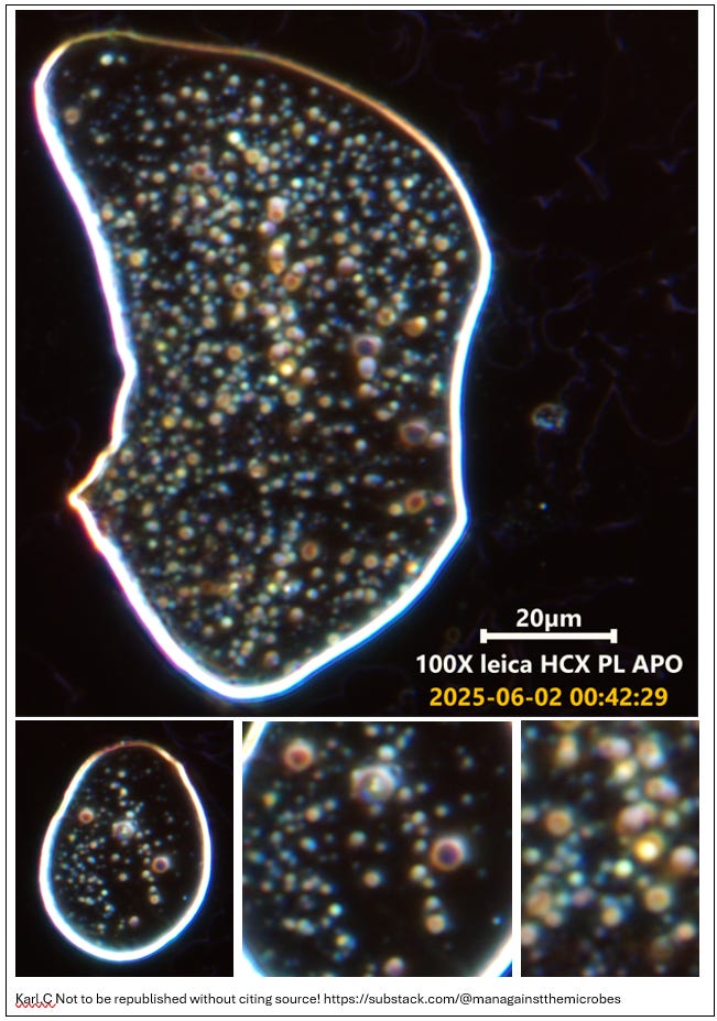 Vesicle shots in this diagram serve to reveal the membrane at 2 different light settings. Setting gain low allows compartmentalized detail to be seen, confirming that these are not natural exosomes or lipid materials. They have bi-layers and are therefore man-made and designed by all counts when considered with the self-assembling material forming internally. The fact these vesicles and their morphological processes do not differ from the vaccine, RAT or anesthetic samples and that processes can be matched is also a deal breaker for the fact checkers out there.